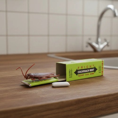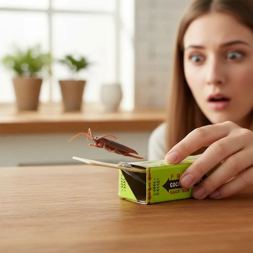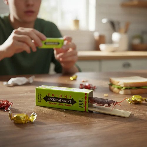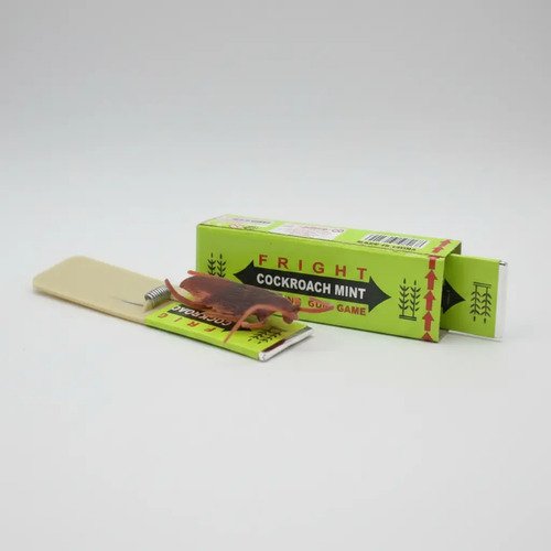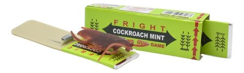 Divertido juego de broma en forma de caja de chicle. Al tirar del supuesto chicle, una cucaracha de goma salta y toca el dedo de la persona, generando sorpresa y risas aseguradas.