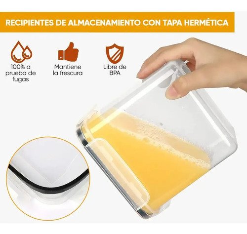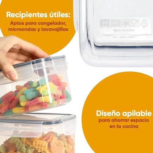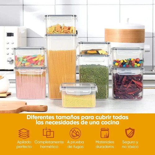 ¡Organizá tu cocina como siempre soñaste con nuestro set de 7 recipientes herméticos para alimentos! Fabricados con materiales de alta calidad, estos frascos son IDEALES PARA CONSERVAR TODO TIPO DE ALIMENTOS como cereales, harinas, arroz, avena, azúcar, café y yerba. Gracias a su DISEÑO TRANSPARENTE con tapa negra, vas a poder ver el contenido de un vistazo, sin necesidad de abrirlos.