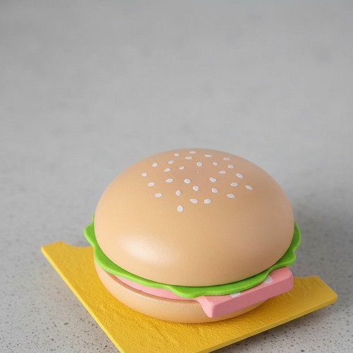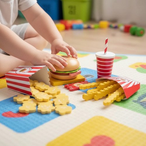 Juego completo de comida infantil ideal para juegos de rol, donde los niños pueden simular la preparación y venta de hamburguesas de forma divertida y educativa.