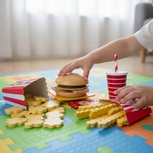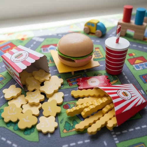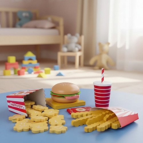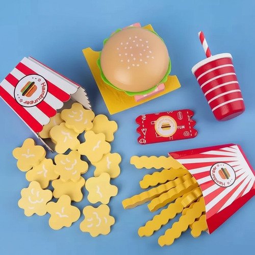 Incluye hamburguesa, papas, bebida y otros accesorios, fomentando la imaginación, la creatividad y el desarrollo social a través del juego simbólico.