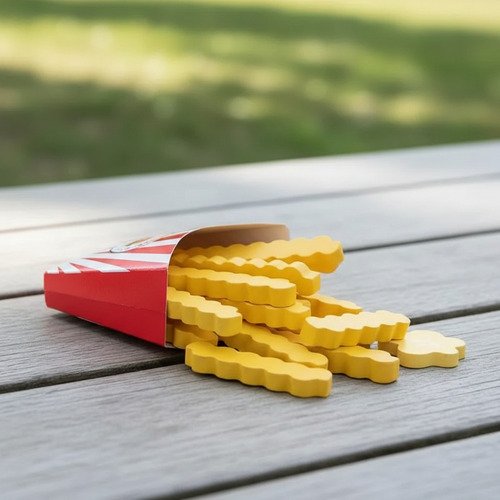 Las piezas del juego están fabricadas en madera, mientras que los envases son de cartón, combinando resistencia y un diseño atractivo. Ideal para complementar cocinitas y juegos de mercado.
